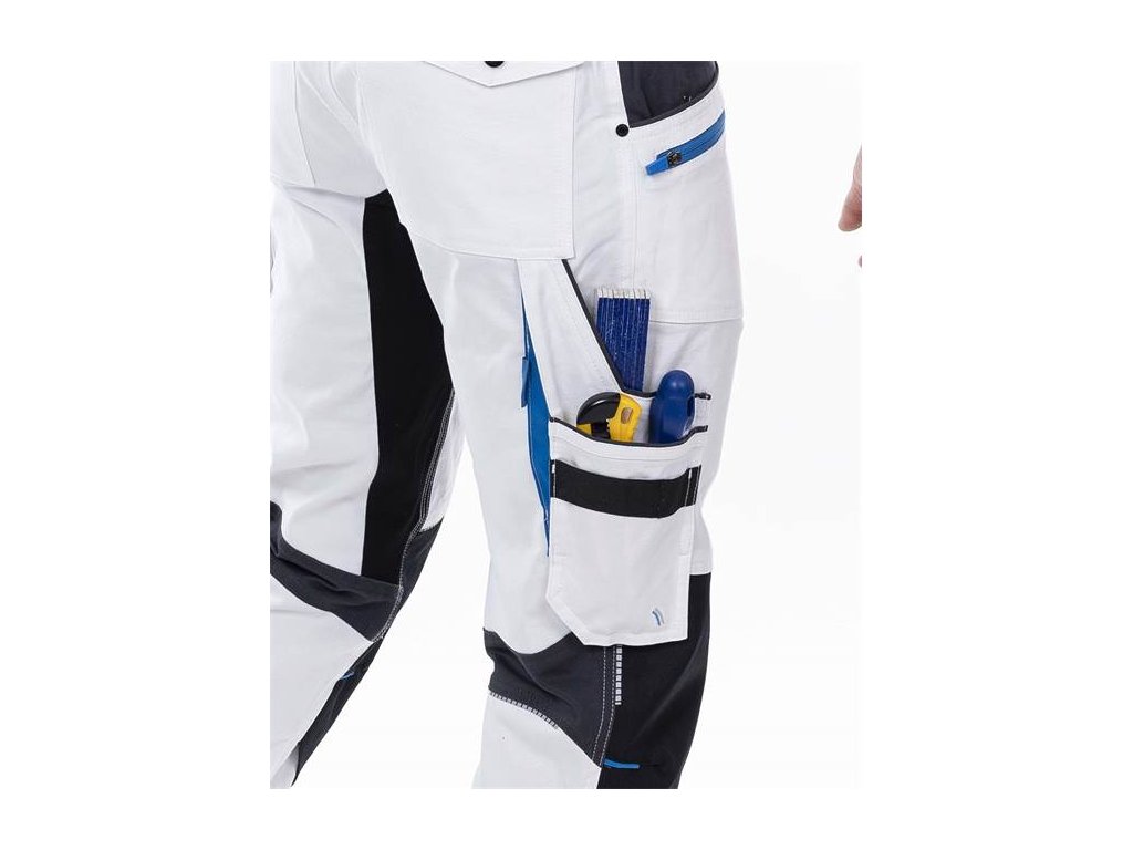 - na pravé nohavici je umístěna multifunkční kapsa na skládací metr, šroubovák a odlamovací nůž s širokými poutky, na levé nohavici je velká dvojitá kapsa krytá patkou na druk