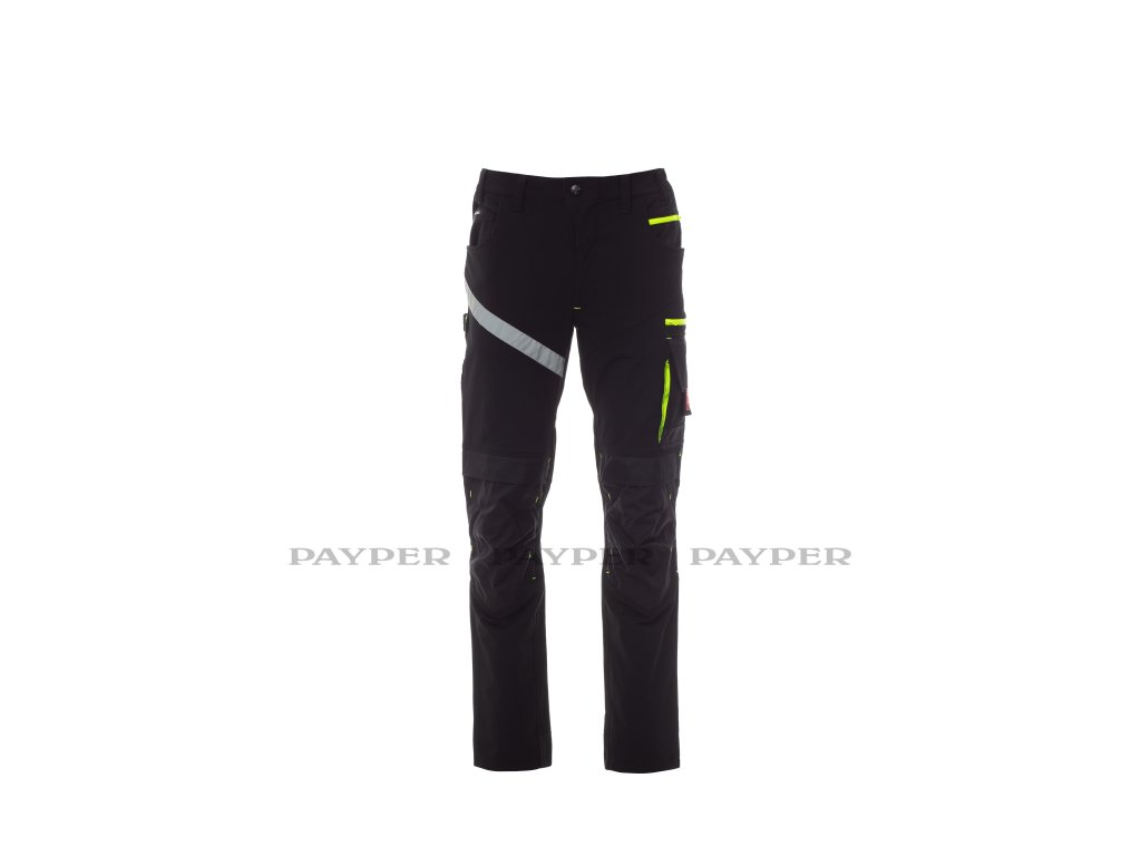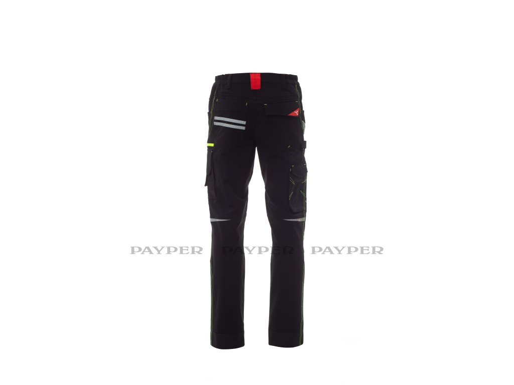 Unisexové kalhoty „4 way stretch“, celoroční, gumičky na bocích a poutka na pásek v pase, zapínání na zip a přizpůsobený knoflík. Na přední straně kalhoty mají dvě zakulacené kapsy, na pravé straně kapsičku na mince a na levé straně bezpečnostní kapsičku na zip. Na přední straně levé nohavice jsou tři kapsy: vodorovná kapsa se zapínáním na zip, kapsa s tvarovanou klopou na suchý zip a pouzdrem na jmenovku, malá svislá kapsa se zapínáním na zip. Na přední straně pravé nohavice je reflexní páska. Obě nohavice mají připevnění pro chrániče kolen z Nylon Oxford 500D s rozepínáním seshora. Na zadní straně je kapsa s malou klopou na suchý zip a kapsa bez klopy se 2 reflexními páskami, kapsička na kladivo (pravá nohavice), otevřená kapsička na svinovací metr (pravá nohavice) a kapsička na telefon s klopou na suchý zip (pravá nohavice), reflexní vložky ve výšce kolen (obě nohavice), patní chrániče z kontrastní látky (obě nohavice). Boční prošívání a kontrastní výztuže na různých místech. Italské prostřední velikosti 48-50-52 mají běžnou vnitřní délku nohavic 82 cm.