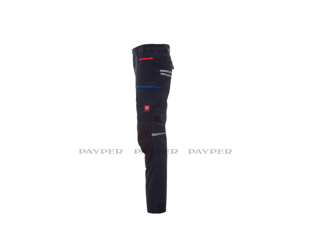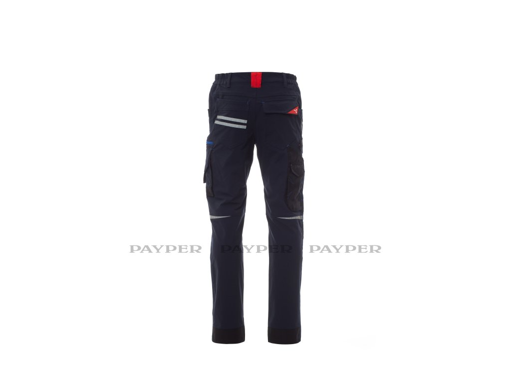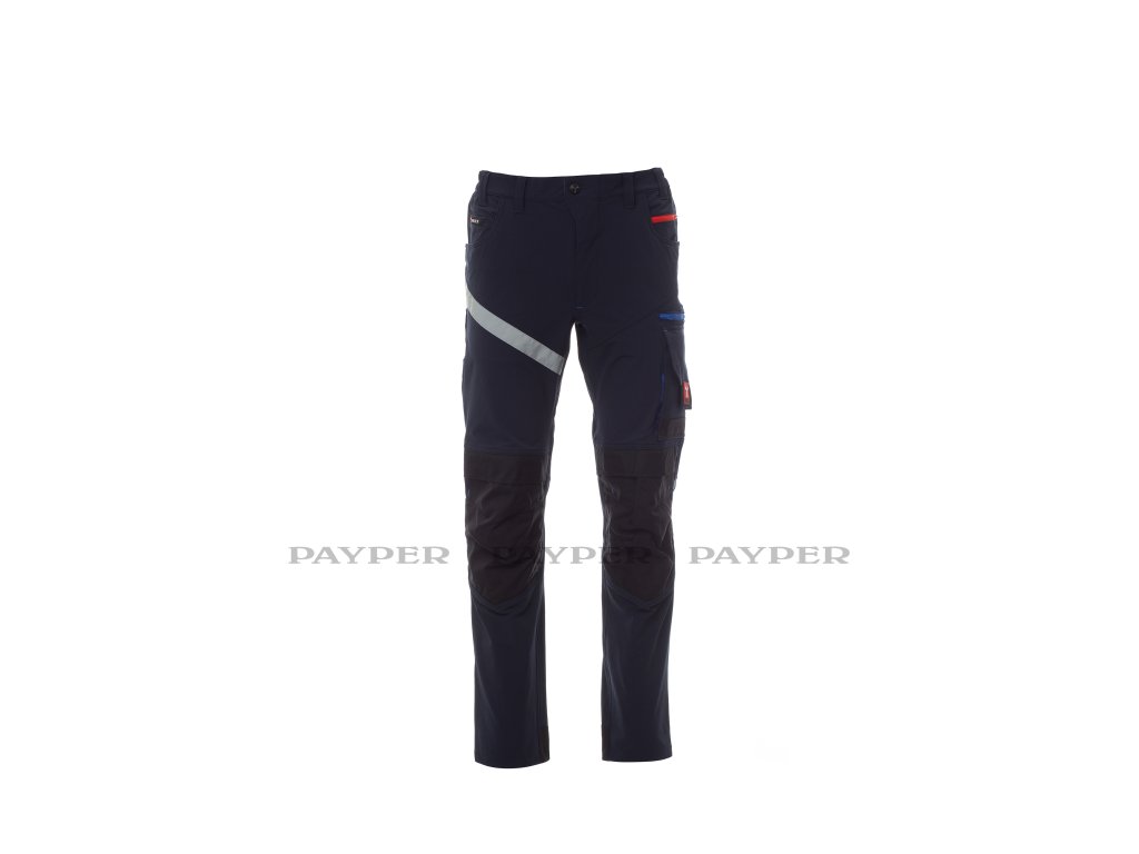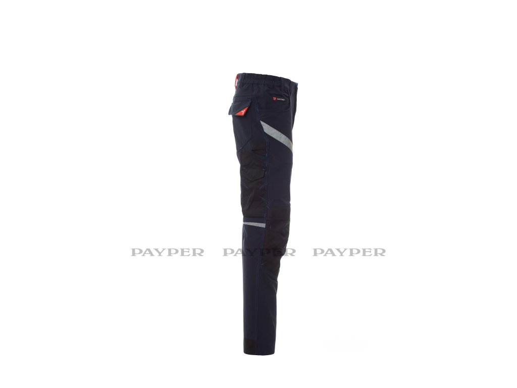 Unisexové kalhoty „4 way stretch“, celoroční, gumičky na bocích a poutka na pásek v pase, zapínání na zip a přizpůsobený knoflík. Na přední straně kalhoty mají dvě zakulacené kapsy, na pravé straně kapsičku na mince a na levé straně bezpečnostní kapsičku na zip. Na přední straně levé nohavice jsou tři kapsy: vodorovná kapsa se zapínáním na zip, kapsa s tvarovanou klopou na suchý zip a pouzdrem na jmenovku, malá svislá kapsa se zapínáním na zip. Na přední straně pravé nohavice je reflexní páska. Obě nohavice mají připevnění pro chrániče kolen z Nylon Oxford 500D s rozepínáním seshora. Na zadní straně je kapsa s malou klopou na suchý zip a kapsa bez klopy se 2 reflexními páskami, kapsička na kladivo (pravá nohavice), otevřená kapsička na svinovací metr (pravá nohavice) a kapsička na telefon s klopou na suchý zip (pravá nohavice), reflexní vložky ve výšce kolen (obě nohavice), patní chrániče z kontrastní látky (obě nohavice). Boční prošívání a kontrastní výztuže na různých místech. Italské prostřední velikosti 48-50-52 mají běžnou vnitřní délku nohavic 82 cm.