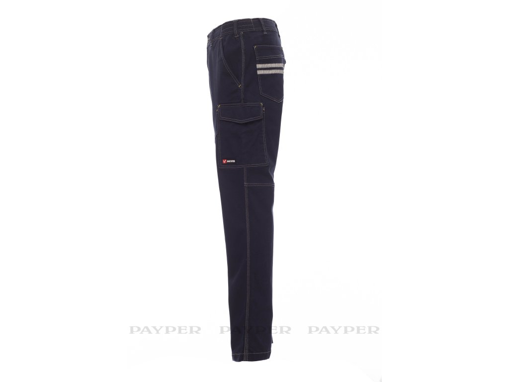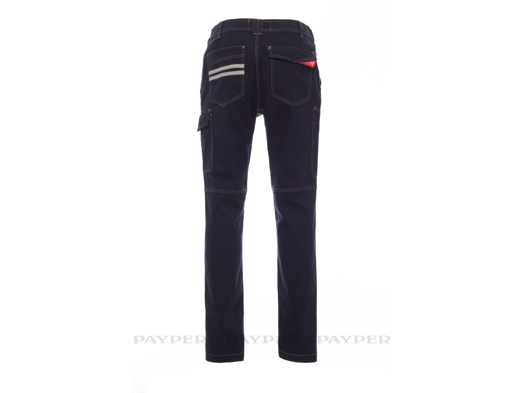 Unisexové kalhoty, stretch, celoroční, elastické pásky na bocích a poutka v pase, zapínání na zip a plastový knoflík, dvě přední kapsy klasického střihu, jedna postranní kapsa LOCK SYSTEM, jedna kapsa na svinovací metr, dvě zadní kapsy, z nichž jedna otevřená a druhá s klopou na suchý zip, švy v rozkroku a na vnitřní straně nohavice s trojjehlovým prošitím. Kontrastní vsadky a prošití, reflexní pruhy na zadní kapse, trojí prošití. Druk pro bílou barvu.
