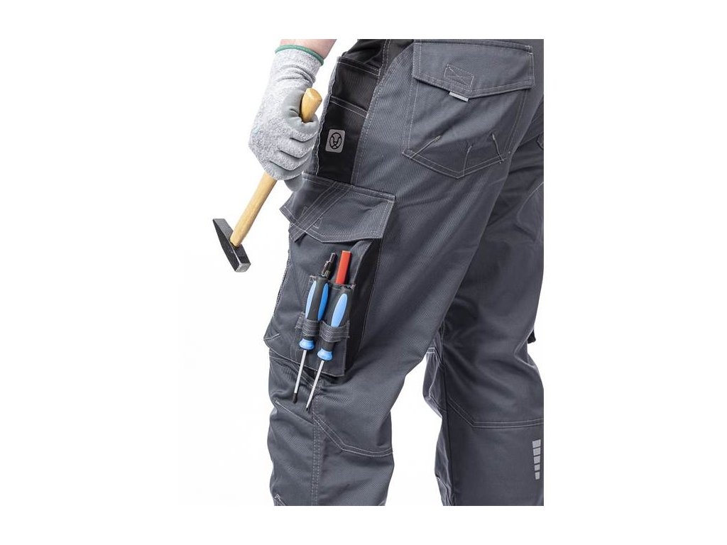 - 1 zipová kapsa na mobil, kapsy na šroubovák, poutka na tužky, 2 kapsy na skládací metr integrované do lampasu na levé i pravé straně
